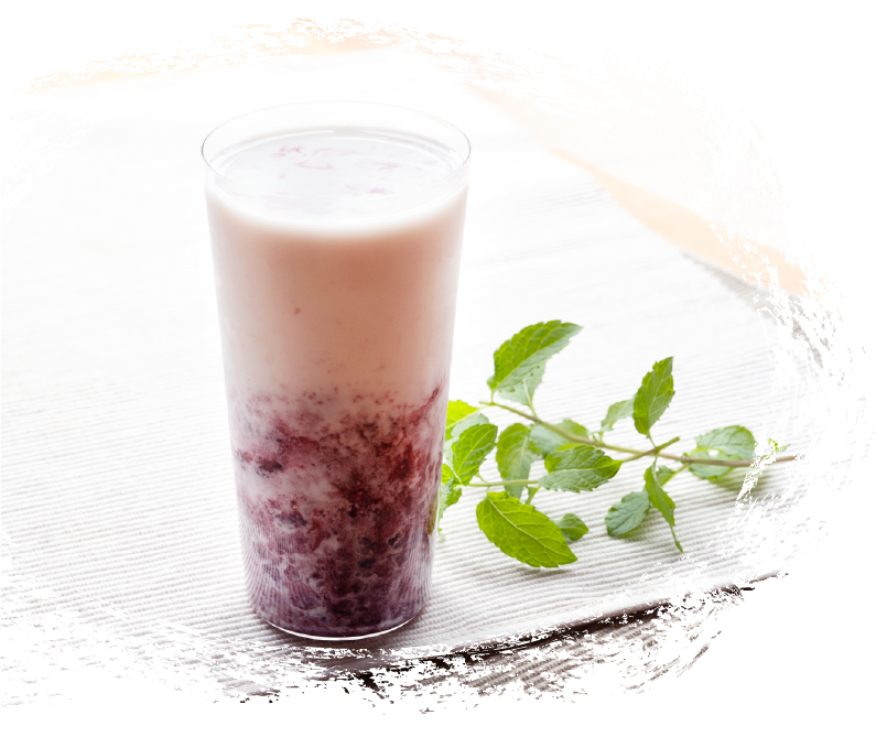 いろんな飲み方が楽しめるブラックベリージュース。中でもスタッフのお勧めは、牛乳と混ぜて飲むヨーグルト風のドリンク!ジュースと牛乳を3:1の割合で混ぜると、とろみのついたドリンクに。